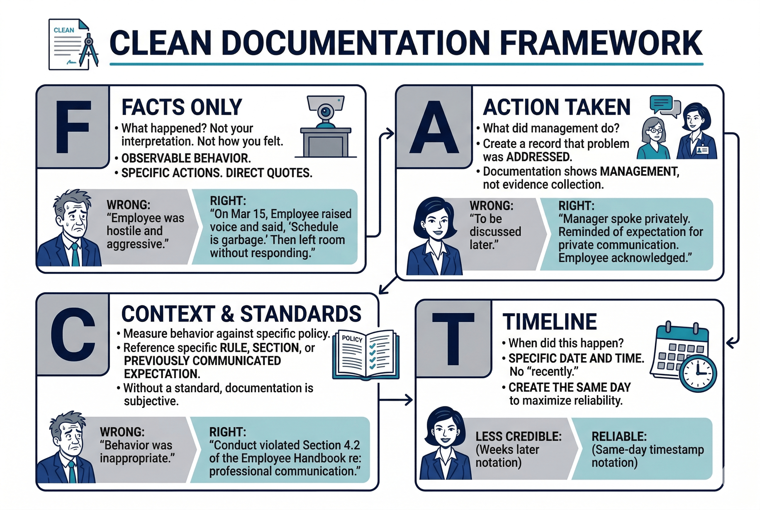 The best documentation is the documentation you'd be comfortable reading aloud in a courtroom. Factual, specific, balanced, and boring. No opinions. No speculation. No editorializing. Just what happened, when it happened, what the standard was, and what you did about it.